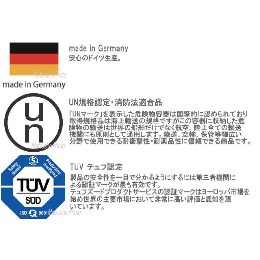 hunersdorff Metal Canister CLASSIC 20L ■オイルタンク容量■ 燃料容量:20L ■素 材■ スチール ■重 量■ 本体重量:約4280g ■サイズ■ 幅16.5cm×奥行34.3cm×高さ46.9cm ■詳 細■ ドイツのTÜF規格認証、危険物運搬用として国連(UN)の認証も受けており、 最高水準の安全性と信頼性を誇るるヒューナースドルフ社のメタルジェリカンです。