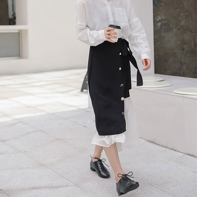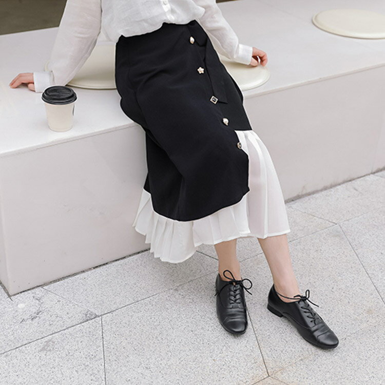 サイズ(約) S(スカート丈73cm/ウエスト66cm/ヒップ92cm) M(スカート丈74cm/ウエスト70cm/ヒップ96cm) L(スカート丈75cm/ウエスト74cm/ヒップ100cm) 生地/素材 シフォン+コットン カラー ブラック×ホワイト 商品説明 韓国デザインのフロントボタン アシンメトリー Aラインスカート ラップスカートにプリーツの切り替えデザイン! 一個ずつ違うアンティークなボタンがレトロな雰囲気の膝丈スカート。
