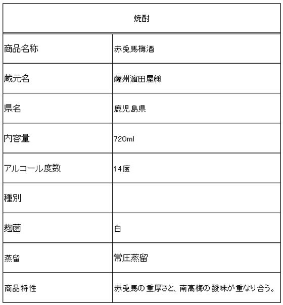 【商品説明】鹿児島県産南高梅を使用した芋焼酎「赤兎馬」に漬け込んだ本格梅酒。